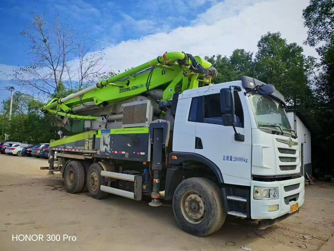 Cette pompe à béton montée sur camion (modèle : ZLJ5280THBJE) est fabriquée par Zoomlion Heavy Industry Science and Technology Co., Ltd. Elle a été produite en mars 2021 et porte le numéro de série 016396A1210010. Avec un modèle de châssis CA5300THBPIK2T2BE5A81 et un modèle de moteur CA6DL1 - 32E5 (puissance nette maximale : 235 kW à 2300 tr/min), elle offre une portée verticale maximale de 42,3 m, une portée horizontale de 37,65 m et un débit de béton théorique de 100/60 m³/h. Elle peut fournir du béton à une pression de 8/15 MPa, a une masse brute du véhicule de 28000 kg, une masse à vide de 27870 kg et des dimensions de 10950 mm * 2550 mm * 3960 mm.